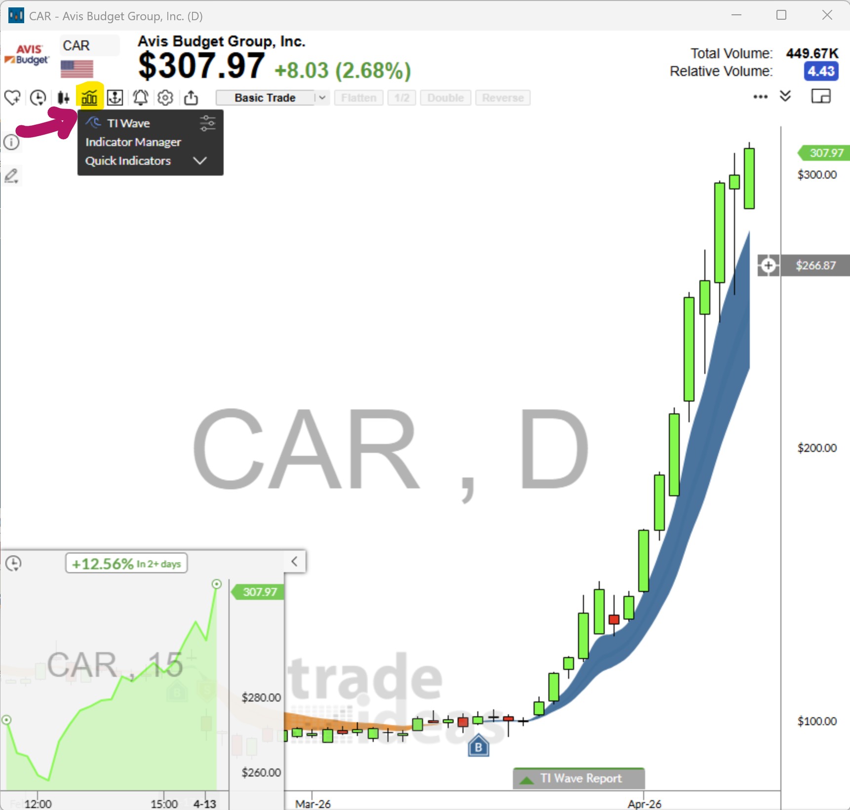 To add TI Wave Buy and Sell signals to your chart, click the bar icon and select TI Wave from the list.